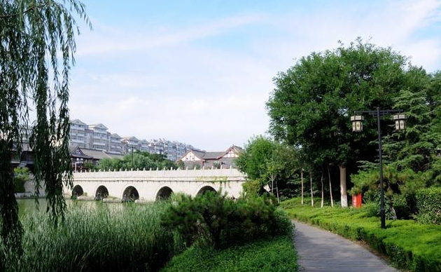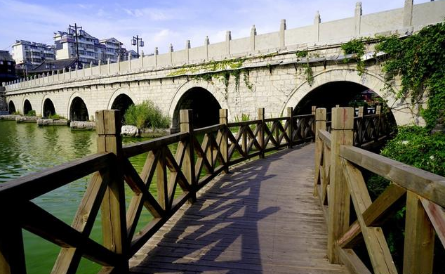 从青州古城北门老街出来,走过万年桥就到了仿古宋城。万年桥是一座建于明万历二十二年(公元1594年),完善于清康熙三十五年(公元1696年)的老古董,距今已经有了400多年的时光。过去人们习惯地称它为虹桥、飞桥、南阳桥,现在人们称它为万年桥。这座桥见证了青州古城的过去与现在,见证了古桥两岸日新月异的变化,同时也见证了宋城的建设与发展。