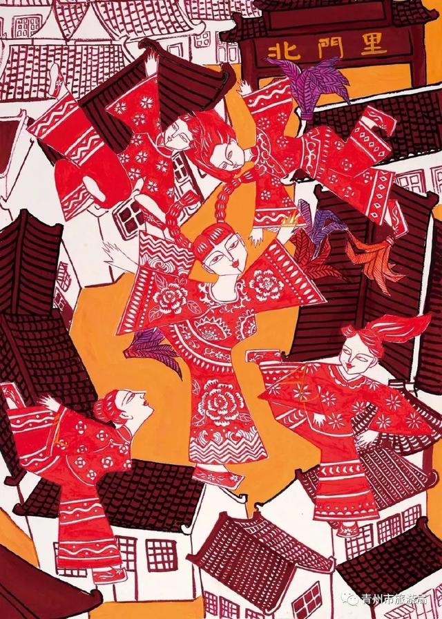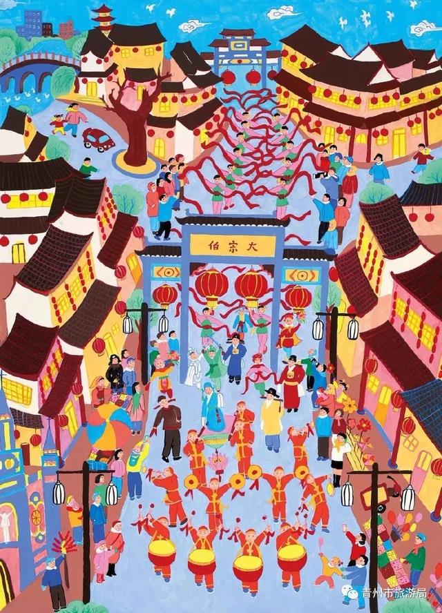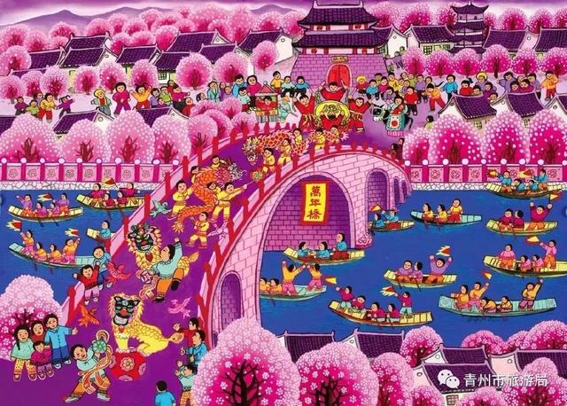 青州的农民画作品想象丰富,构图饱满,色彩鲜艳,融入了大量具有典型青州特色的民俗元素。