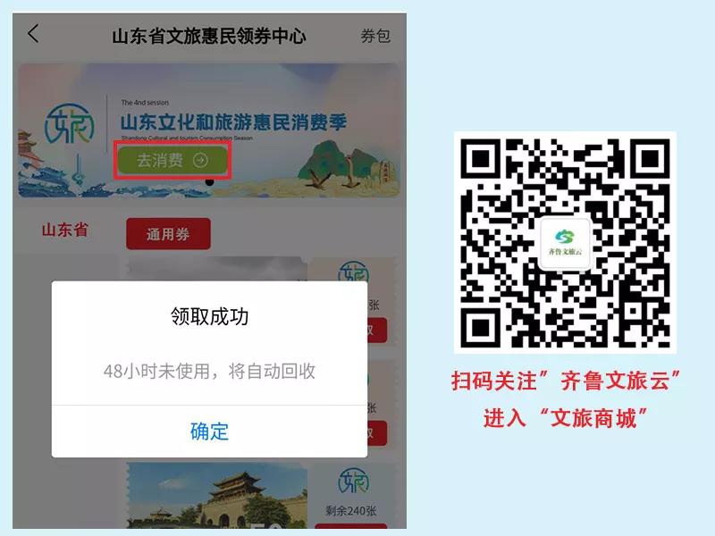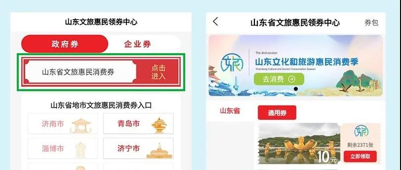 点击“领券中心”进入后,选择上方“山东省文旅惠民消费券”点击进入,领取适合使用的惠民券。
