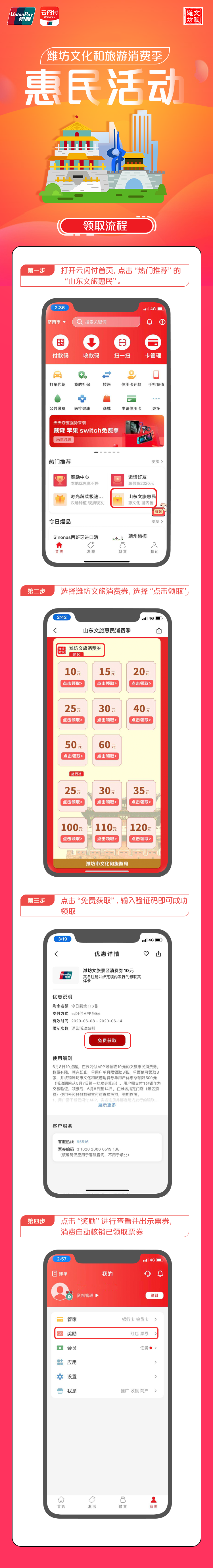 没抢到的小伙伴也不要难过哦!为方便暑期亲子游,“周末免费游潍坊”活动特推出暑期消费券,从6月29日到8月底, 每周一10:00,锁定“云闪付”app,机会还有很多!