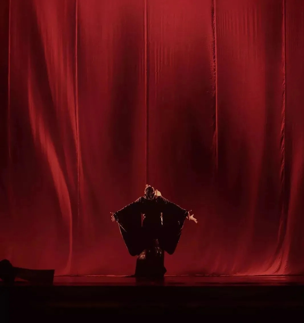 红色幕布半开,露出舞台中央悬挂的一只红色灯笼,灯光打下来,灯笼的影子在地面上变了形,仔细聆听,空气中有断断续续的虫鸣声。