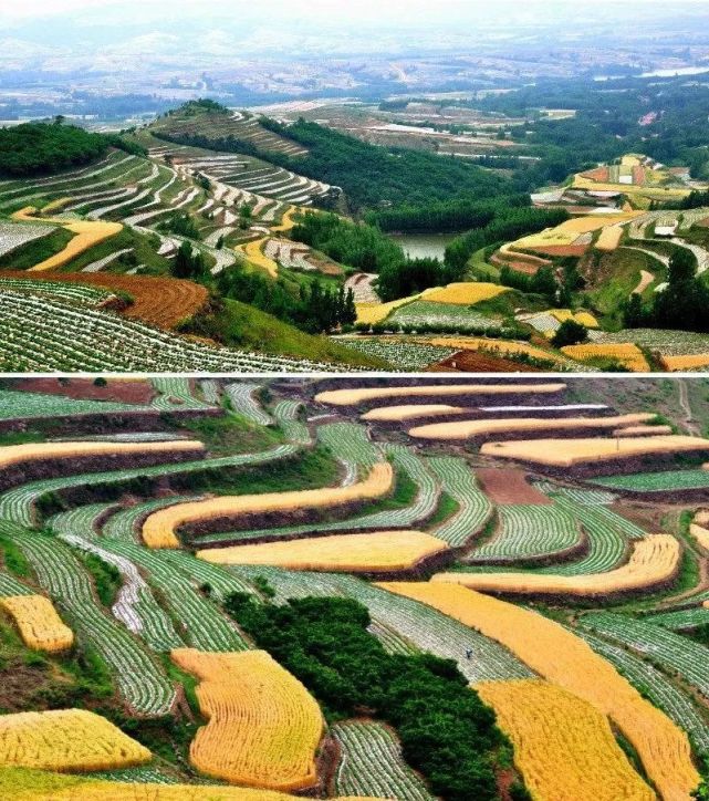 安丘市吾山镇,群山竞秀,绿树环抱,这里的梯田就像颜料盘洒落在了这片山地丘陵上。形状也千变万化,层层叠叠,雄伟壮丽,气势磅礴,既壮观又秀美。