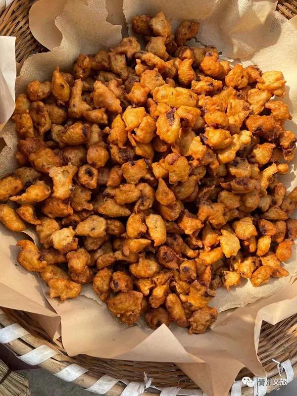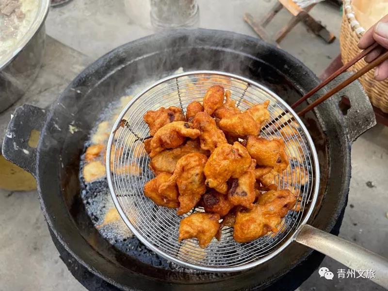 肉蛋,其实就是将鸡剁成小块,用葱、姜、盐、酱油等调味料腌制,然后裹上厚厚的面糊,下油锅炸制而成。旧时,物质条件不像现在这么优渥,过年能有一只鸡,就已经很不错,为了整个年节都有鸡吃,人们就把鸡剁碎,裹上面糊,炸出来,这样一只鸡就能炸一大盆肉蛋,每顿饭做个肉蛋汤,足够吃到年节结束。听镇上的老人说,那时候,家家户户还比,谁家的肉蛋挂的面糊厚,谁家用一只鸡炸出来的肉蛋多。如今,生活好了,过年才能吃到的肉蛋,已经成了一道平时饭桌上的家常菜,肉蛋里面也换成了大块猪里脊或者鸡肉,也不再挂上厚厚的面糊,但是每到过年,庙子镇的老百姓,还是会杀一只鸡,像以前一样,剁成小块,挂上厚厚的面糊,寻找旧时年岁,那一口“年”的味道。