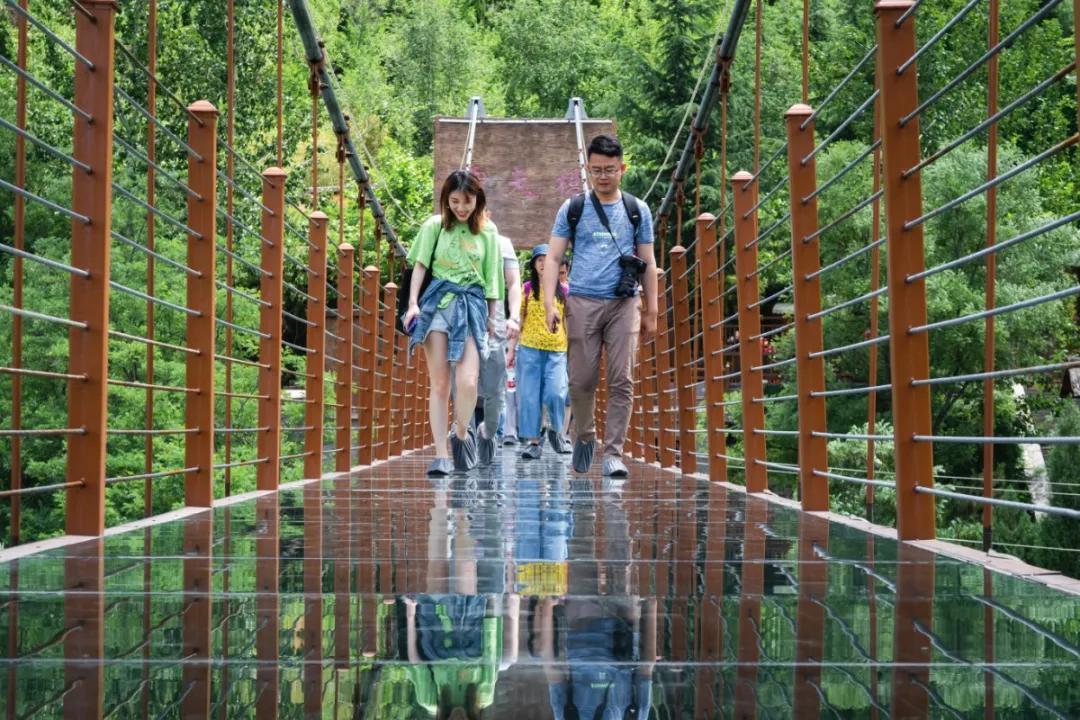 山沟的溪流清澈,鱼儿游弋,沿途分布着休息凳,可供游人随时休息。