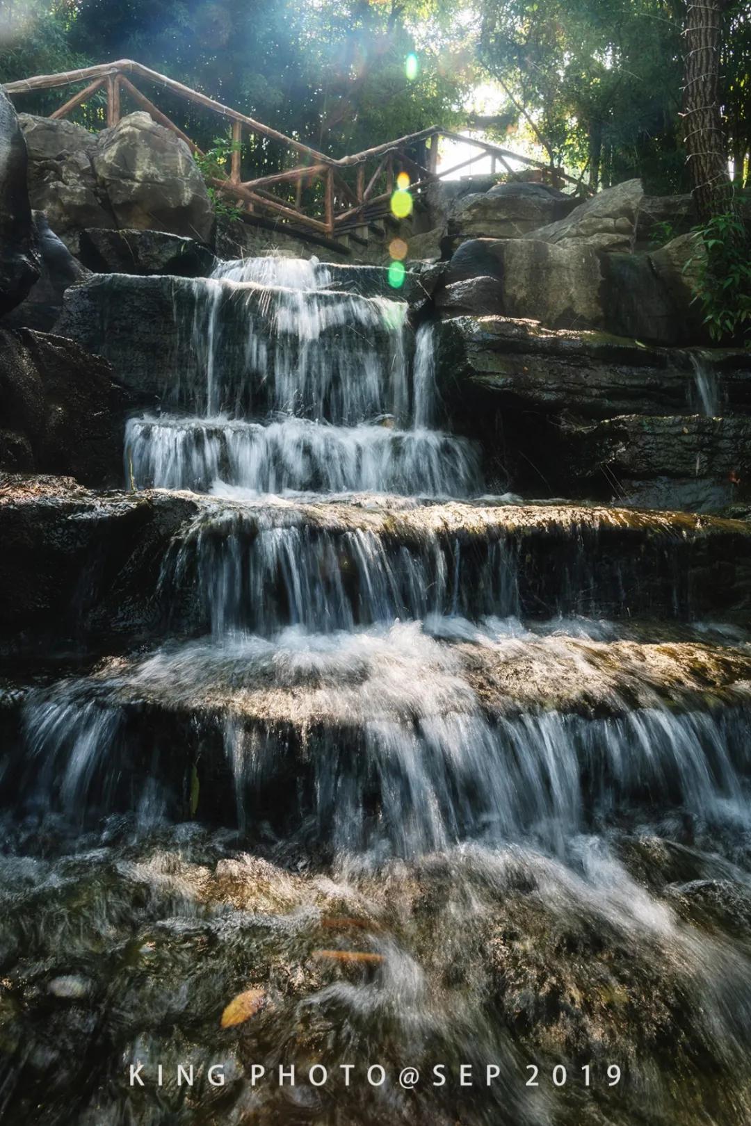 △//悬布池水高处流下,“哗哗”声响拍打山石,池中金鱼欢快的游动着