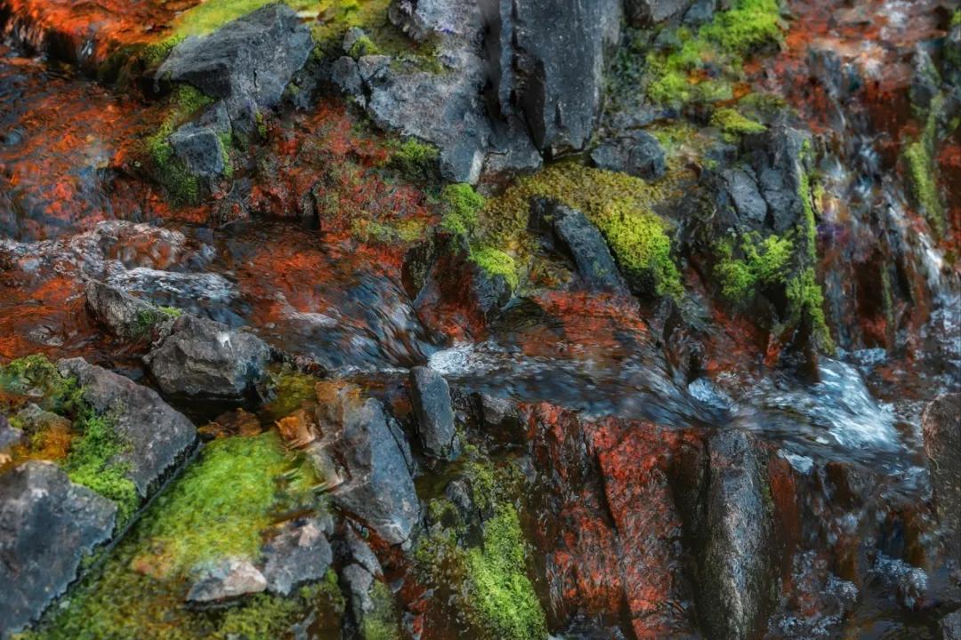 △//一场中雨冲刷山体,涓涓细流“哗哗”流下,水流边也生出了青苔