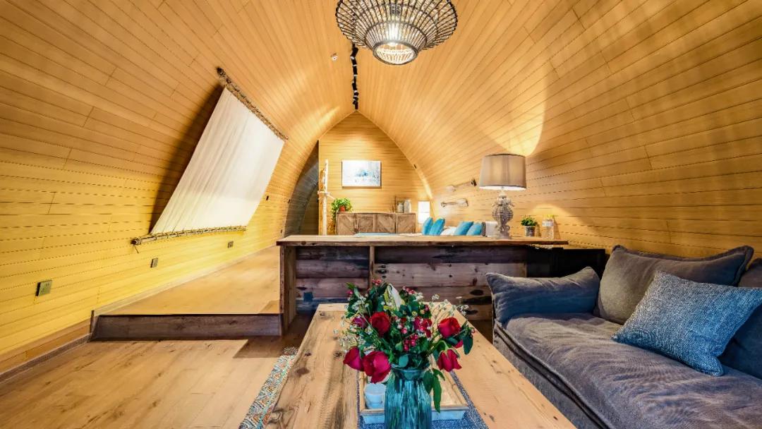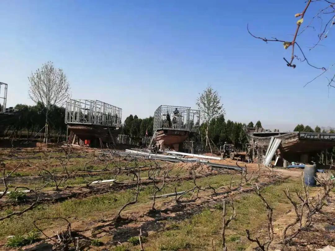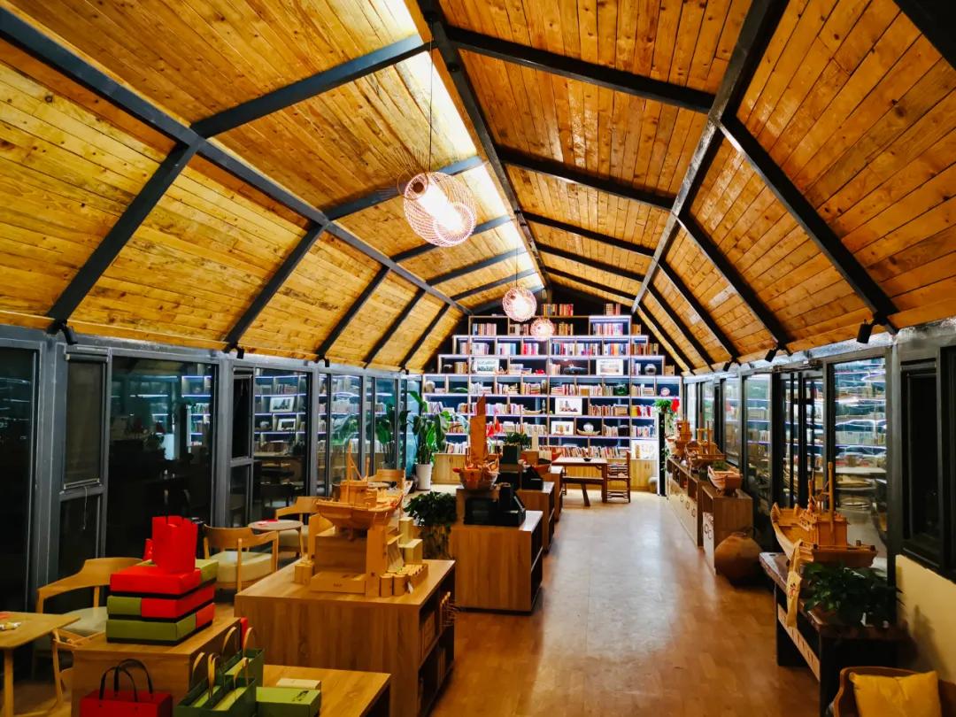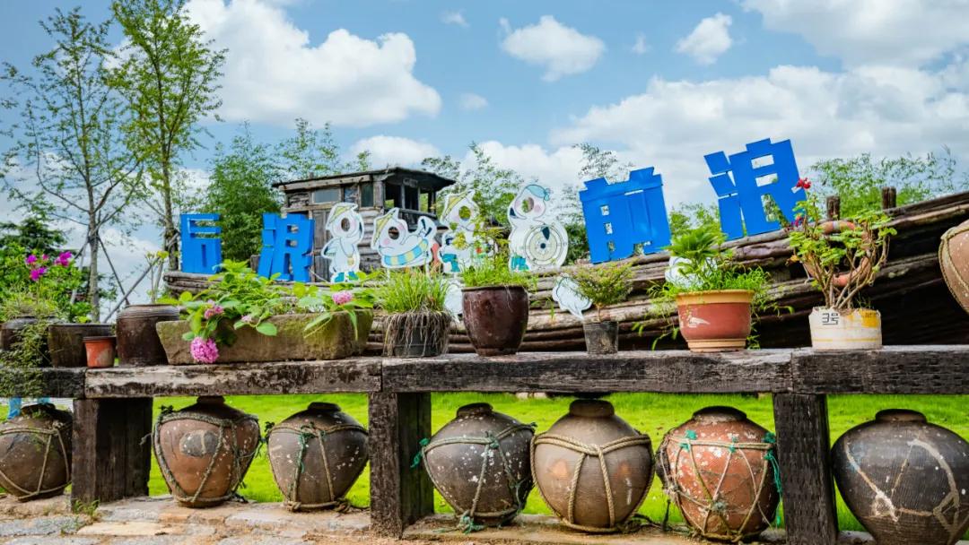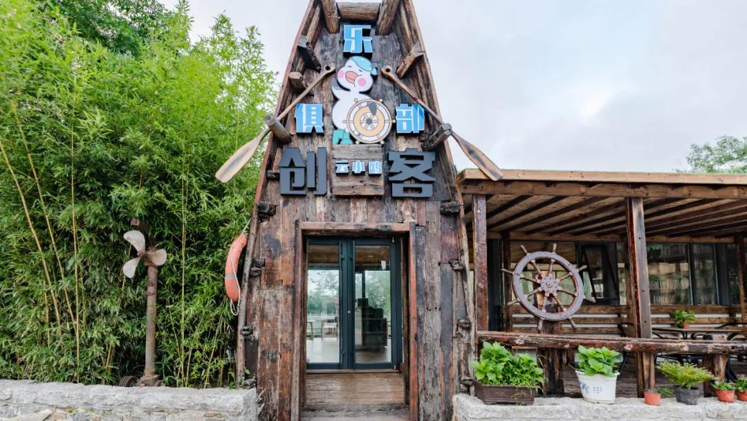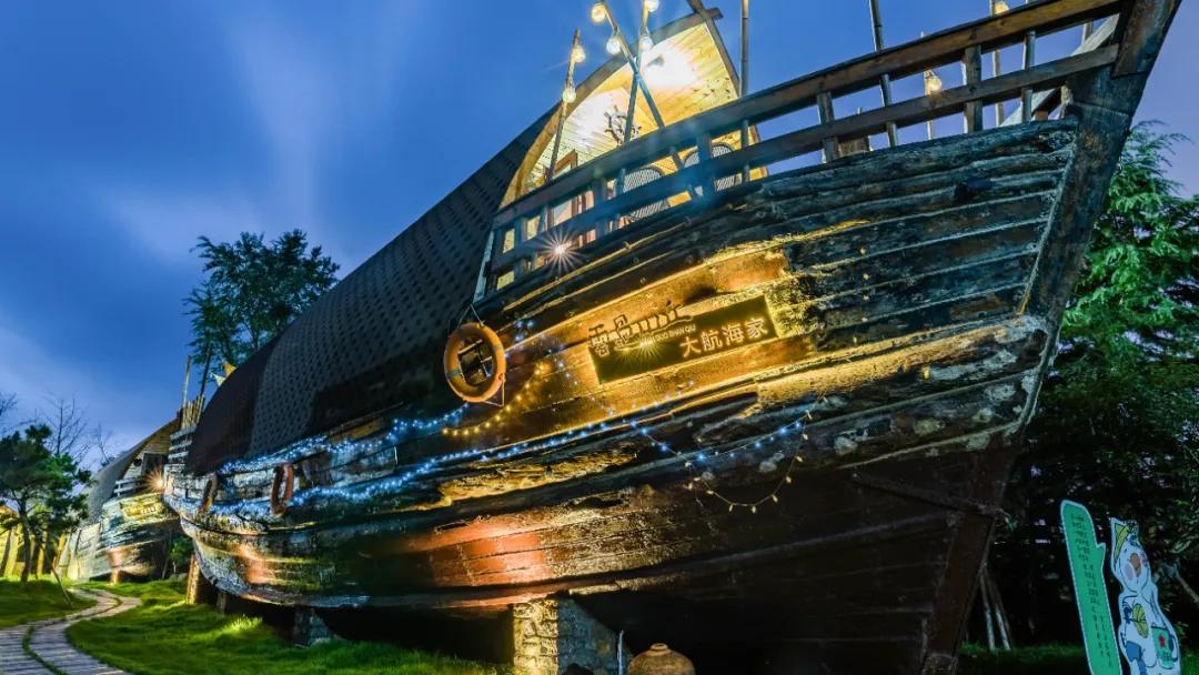 “离开老船上了岸,却在梦里听见海”。云过山丘茶旅文化园利用退役老船,通过艺术改造,融合海洋渔业元素,建设成能满足游客吃住游娱购的船屋民宿——七墩八台船屋民宿。新改造提升的船坞分三块区域,每个区域有不同的主题,分别是扬帆起航、海中捕捞、出海归来三个主题。