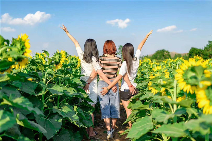向日葵在很多人的印象中都是黄色的,但在杏花村王府庄园还可以欣赏到其它颜色的品种,比如红色、橙色、复色……这里春日槐花飘香,夏日浓荫蔽日,随着这里的向日葵盛开,瞬间变成了网红景点。