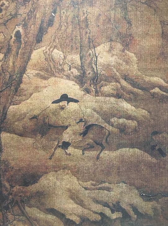 李成的《读碑窠石图》中光秃秃的树木、空旷广阔的郊外田野、蟹爪一样的枯枝、骑骡人与童仆,萧索的气象,平远的景物,典型的李成“惜墨如金”风格,给人以遥距千里又秀色可掬的感觉。